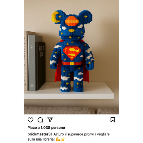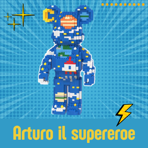 Di giorno, Arturo sembra un orso qualsiasi. Ma alla minima ingiustizia, il suo mantello rosso sventola e il suo medaglione si illumina. Non salva grattacieli, salva giornate: raccoglie i pezzi dopo un fallimento, infonde coraggio prima di un colloquio e si siede vicino all'ingresso per ricordarti che andarsene è già una vittoria. Arturo non ha paura: va avanti, anche quando i mattoni sembrano non combaciare più. E, una volta costruito, ti sussurra: "Hai già fatto la parte più difficile".