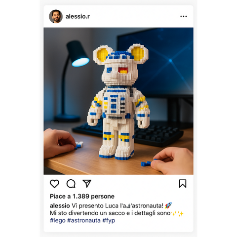 Luca ha sempre guardato in alto. Il suo casco riflette sogni rotondi come pianeti. Non cerca la destinazione perfetta; ama l'orbita, la sensazione di imparare strada facendo. L'ultimo mattone? È il decollo. Ti aspetta sulla scrivania per ricordarti: "La prossima idea può cambiare tutto".Ajouter une description pour cet onglet 1